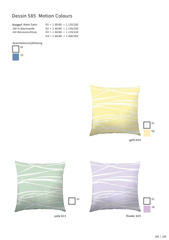 Dessin 585 Motion Colourskaeppel Mako Satin100 % Baumwolle mit ReissverschlussD1 = 1 80/80 + 1 135/200D2 = 1 80/80 + 1 155/200D3 = 1 80/80 + 1 155/220D4 = 2 80/80 + 1 200/200Spannlakenempfehlung0122jade 62301gelb 6040106flieder 6250118108 | 109