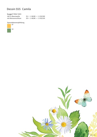 Dessin 555 Camilakaeppel Mako Satin100 % Baumwolle mit ReissverschlussD1 = 1 80/80 + 1 135/200D3 = 1 80/80 + 1 155/220Spannlakenempfehlung073210 | 11