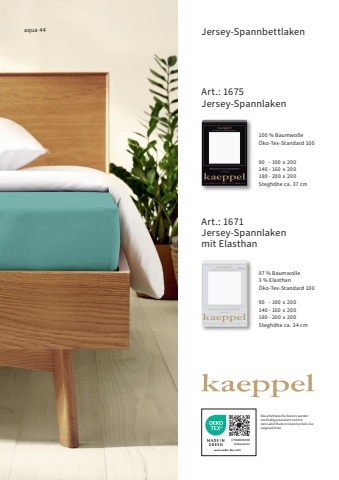 aqua 44 Jersey-Spannbettlaken100 % Baumwolle%u00d6ko-Tex-Standard 10090 - 100 x 200140 - 160 x 200180 - 200 x 200Stegh%u00f6he ca. 37 cmArt.: 1675 Jersey-Spannlaken97 % Baumwolle3 % Elasthan%u00d6ko-Tex-Standard 10090 - 100 x 200140 - 160 x 200180 - 200 x 200Stegh%u00f6he ca. 34 cmArt.: 1671 Jersey-Spannlaken mit ElasthanC7AWB4S358HohensteinDiese Bettw%u00e4sche Dessins werden nachhaltig produziert und mit dem Label Made in Green by Oeko-Tex ausgezeichnet.