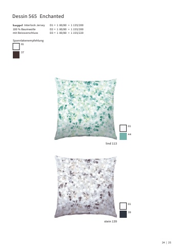 Dessin 565 Enchantedkaeppel Interlock Jersey100 % Baumwolle mit ReissverschlussD1 = 1 80/80 + 1 135/200D2 = 1 80/80 + 1 155/200D3 = 1 80/80 + 1 155/220Spannlakenempfehlung0137lind 1130144stein 139013924 | 25