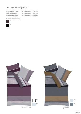 Dessin 541 Imperialkaeppel Mako Satin100 % Baumwolle mit ReissverschlussD1 = 1 80/80 + 1 135/200D2 = 1 80/80 + 1 155/200D3 = 1 80/80 + 1 155/220Spannlakenempfehlung3740bordeaux 6220147gold 624474830 | 31