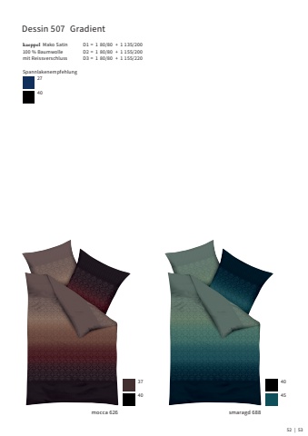 Dessin 507 Gradientkaeppel Mako Satin100 % Baumwolle mit ReissverschlussD1 = 1 80/80 + 1 135/200D2 = 1 80/80 + 1 155/200D3 = 1 80/80 + 1 155/220Spannlakenempfehlung2740mocca 6263740smaragd 688404552 | 53