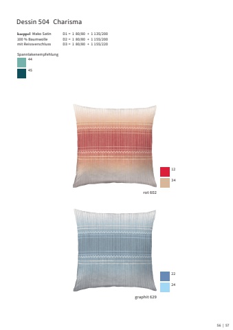 Dessin 504 Charismakaeppel Mako Satin100 % Baumwolle mit ReissverschlussD1 = 1 80/80 + 1 135/200D2 = 1 80/80 + 1 155/200D3 = 1 80/80 + 1 155/220Spannlakenempfehlung4445rot 6021234graphit 629222456 | 57