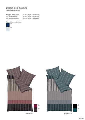 Dessin 510 Skyline(Wendebettw%u00e4sche)kaeppel Mako Satin100 % Baumwolle mit ReissverschlussD1 = 1 80/80 + 1 135/200D2 = 1 80/80 + 1 155/200D3 = 1 80/80 + 1 155/220Spannlakenempfehlung2747braun 6061537graphit 629404560 | 61