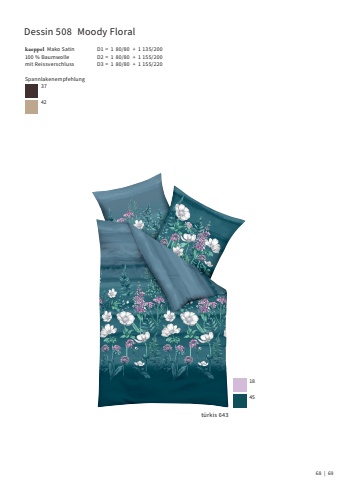 Dessin 508 Moody Floralkaeppel Mako Satin100 % Baumwolle mit ReissverschlussD1 = 1 80/80 + 1 135/200D2 = 1 80/80 + 1 155/200D3 = 1 80/80 + 1 155/220Spannlakenempfehlung3742t%u00fcrkis 643184568 | 69