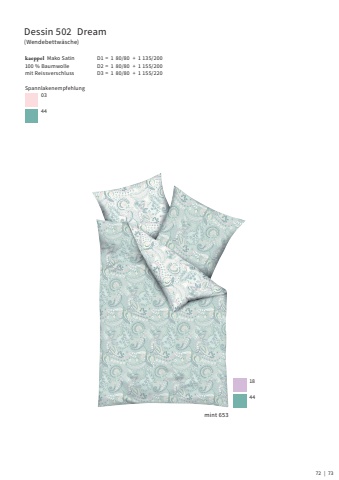 Dessin 502 Dream(Wendebettw%u00e4sche)kaeppel Mako Satin100 % Baumwolle mit ReissverschlussD1 = 1 80/80 + 1 135/200D2 = 1 80/80 + 1 155/200D3 = 1 80/80 + 1 155/220Spannlakenempfehlung0344mint 653184472 | 73