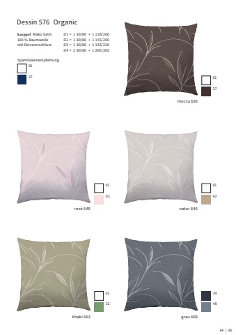 Dessin 576 Organickaeppel Mako Satin100 % Baumwolle mit ReissverschlussD1 = 1 80/80 + 1 135/200D2 = 1 80/80 + 1 155/200D3 = 1 80/80 + 1 155/220D4 = 2 80/80 + 1 200/200Spannlakenempfehlung0127khaki 6630132ros%u00e9 6450103grau 6693948natur 6460142mocca 626013784 | 85