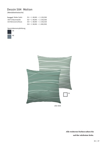 Dessin 584 Motion(Wendebettw%u00e4sche)kaeppel Mako Satin100 % Baumwolle mit ReissverschlussD1 = 1 80/80 + 1 135/200D2 = 1 80/80 + 1 155/200D3 = 1 80/80 + 1 155/220D4 = 2 80/80 + 1 200/200Spannlakenempfehlung3948oliv 63301Alle weiteren Farben sehen Sie auf der n%u00e4chsten Seite.86 | 87